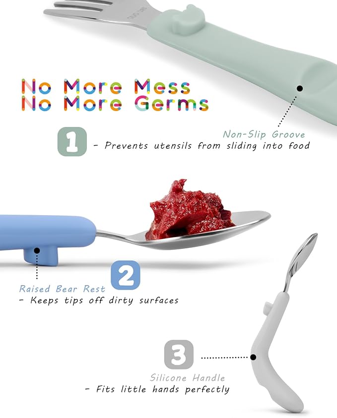 - Secure Platinum Silicone Handles: Platinum silicone grips stay firmly attached, with no peeling or trapped water. Cute bear rest on the back keeps folk and spoon's tips lifted off the table. Parents can trust these toddler utensils for daily use