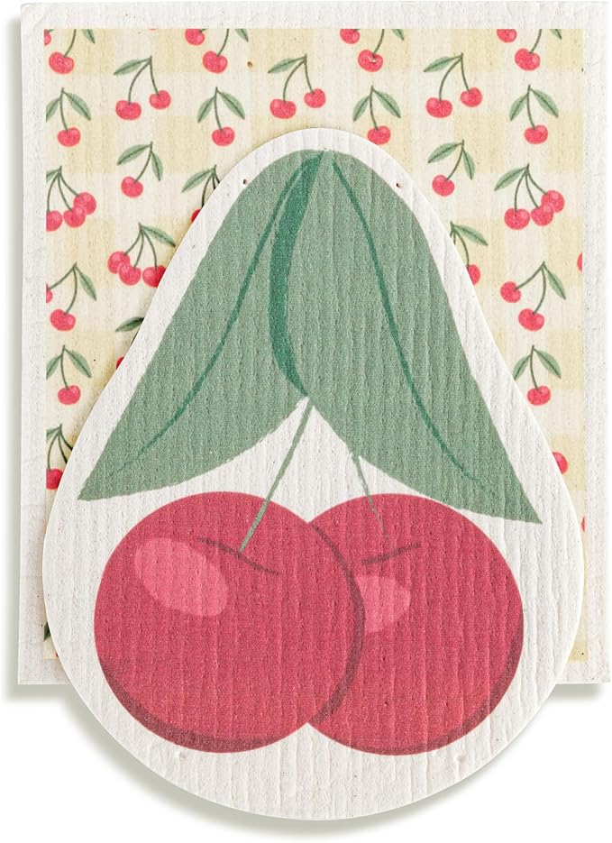 - Keep tidy using these biodegradable dish cloths; One cloth showcases a charming pattern featuring juicy red cherries and the other is shaped like a ripe cherry