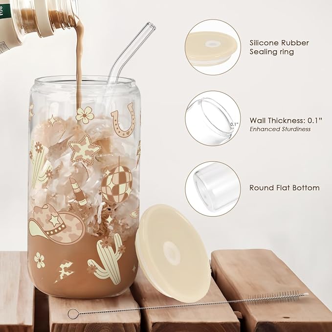 Western Cowgirl 16oz Can Glass Tumbler with Acrylic Lid & Straw, Iced Coffee Cup for Women, Aesthetic Cups Gifts for Birthday Christmas