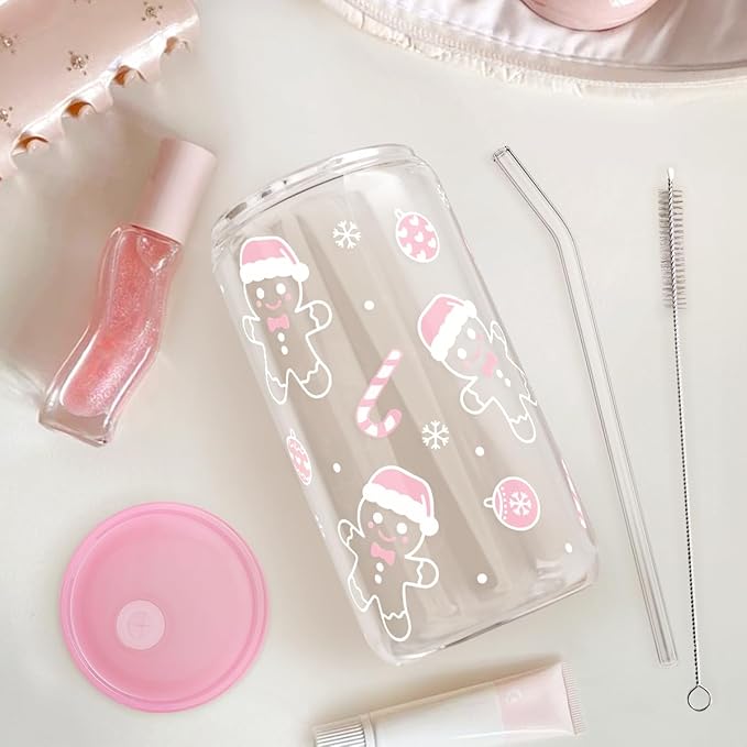 Christmas Gingerbread 16oz Can Glass Tumbler with Acrylic Lid & Straw, Iced Coffee Cup for Women Girls, Aesthetic Cups Gifts for Xmas
