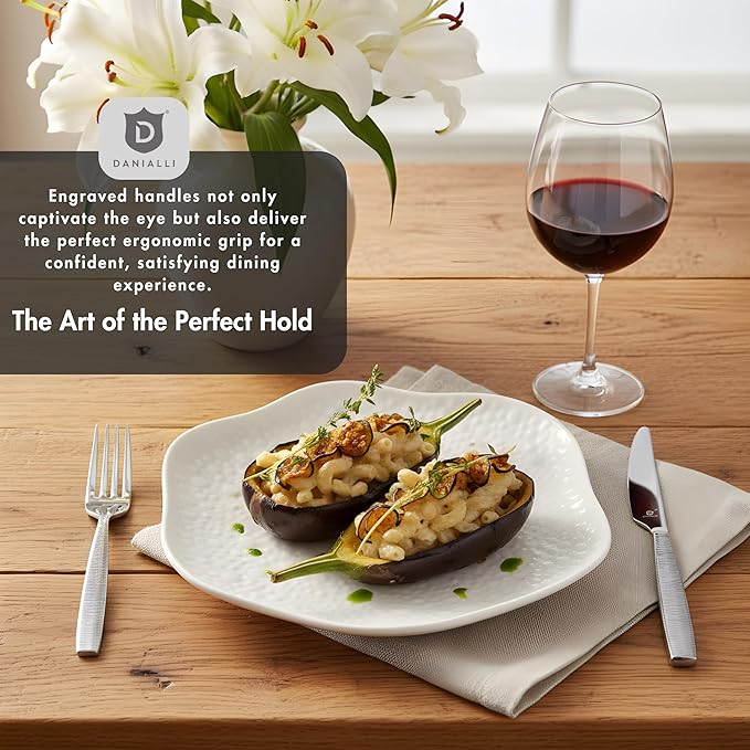- Unique Mezzano Engraved Design – Distinctive engraved handles not only create a sophisticated look but also provide a comfortable, secure, and satisfying grip for an elevated dining experience.