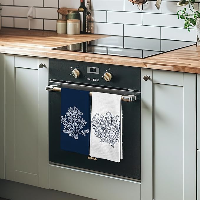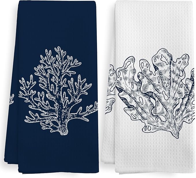 Coastal Beach Coral Summer Bathroom Hand Towels Sets of 2, Nautical Beachy Ocean Theme Bathroom Decor Accessories, Coastal Navy Blue Decor Kitchen Dish Tea Towels for Kitchen, 16x24 Inch