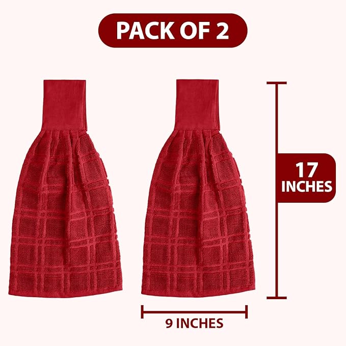 - 9 x 17 Inches Towels Set of 2 - This set contain 2 cotton hanging towels, the rich red color adds a pop of vibrancy to your kitchen décor, while the 9 x 17-inch size makes them compact yet effective for hand-drying and general kitchen tasks. Whether you're a professional chef or a home cook; these perfectly sized dish towels will keep your kitchen clean and organised.