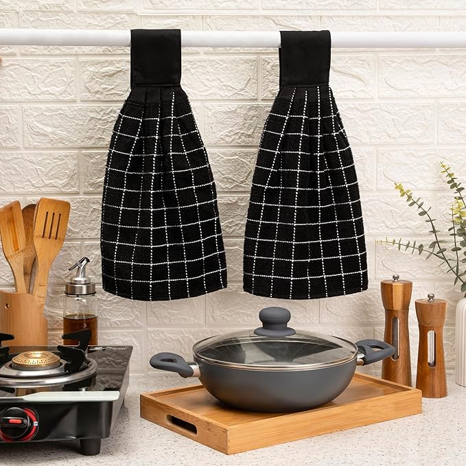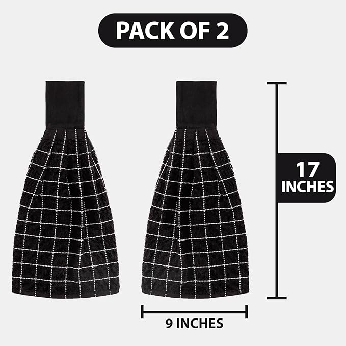 - 9 x 17 Inches Towels Set of 2 - This set contain 2 cotton hanging towels, the rich black & white color adds a pop of vibrancy to your kitchen décor, while the 9 x 17-inch size makes them compact yet effective for hand-drying and general kitchen tasks. Whether you're a professional chef or a home cook; these perfectly sized dish towels will keep your kitchen clean and organised.