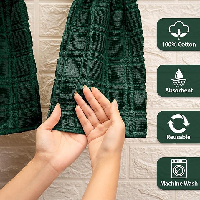 - 9 x 17 Inches Towels Set of 2 - This set contain 2 cotton hanging towels, the rich forest green color adds a pop of vibrancy to your kitchen décor, while the 9 x 17-inch size makes them compact yet effective for hand-drying and general kitchen tasks. Whether you're a professional chef or a home cook; these perfectly sized dish towels will keep your kitchen clean and organised.