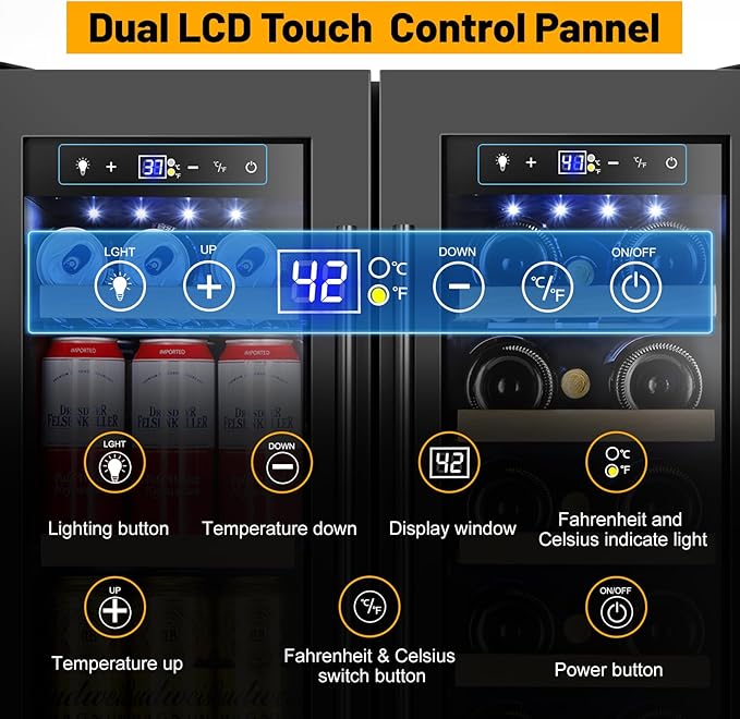 - Precision Cooling with Independent Dual Zones: Wine and beverage cooler with individual temperature control for perfect drink preservation. Left zone 35-50° F, right zone 41-64° F