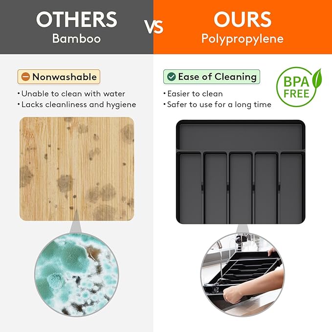 - Robust and Safe: This kitchen drawer organizer is crafted from premium PP material, BPA-free and designed for reliable use. It keeps your silverware in a clean and safe environment