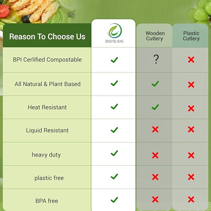- 【Heavy Duty Durable Design】Tired of flimsy disposable forks that snap mid-bite? Degralight disposable forks are designed to be sturdy and reliable and won't bend or break easily. Perfect for handling meats, salads, pasta, and even tough foods - ideal for events or everyday meals.
