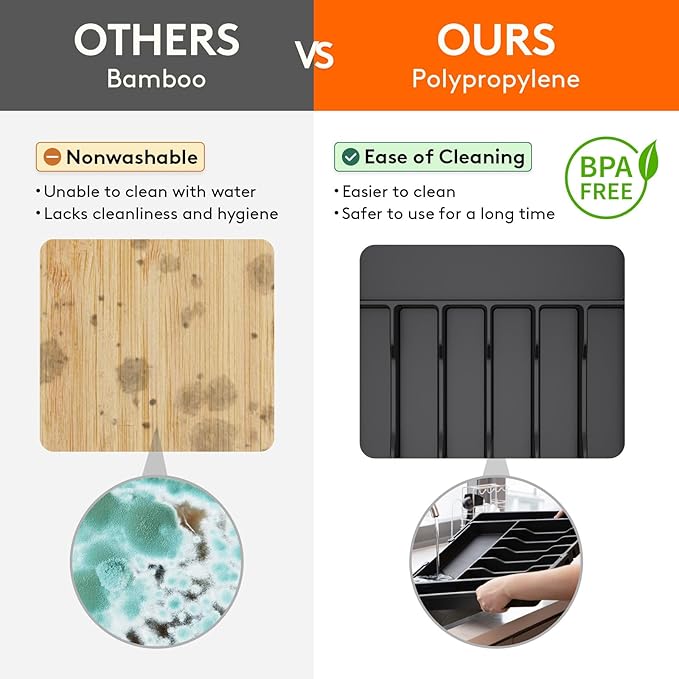 - Robust and Safe: This kitchen drawer organizer is crafted from premium PP material, BPA-free and built to last. It ensures your silverware is stored in a healthy, safe environment for worry-free use