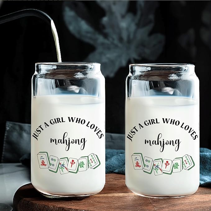 Mah Jong Lover Gifts Glass Cup with Lids and Straws 14oz, Gifts for Women Mahjong Players, Mahjong Accessories Glass Iced Coffee Tumbler Drinking Jars with Cleaning Brush