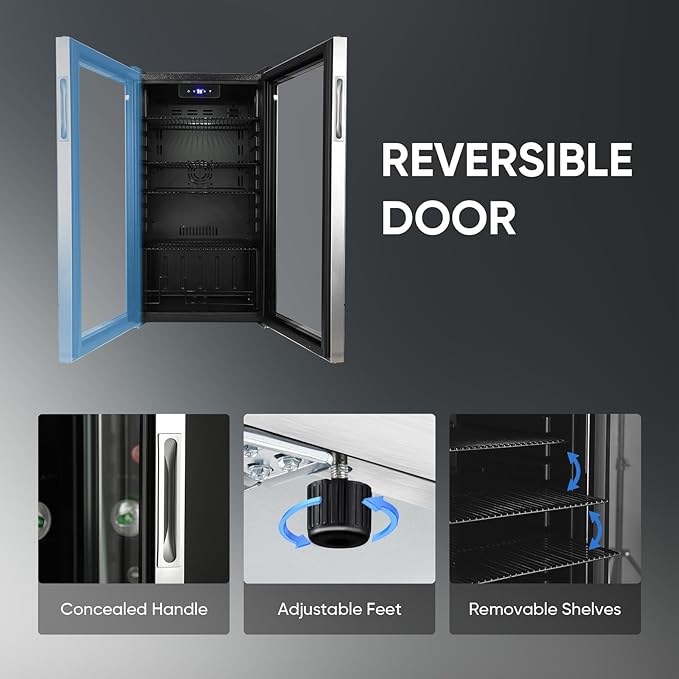 - LOCK IN THE COLD, PLACE FLEXIBLY - This mini fridge features a double-glazed door design, LOW-E coating, and high-density polyurethane insulation to lock in the cold while effectively blocking outside heat and UV rays, ensuring your drinks stay at the ideal temperature. The reversible door panels and adjustable feet make installation a breeze. Its dimensions are 31.29"(H)x17.51"(W)x18.89"(D) for flexible placement. You can place it under the countertop for a stylish built-in look. You can also place it as a standalone unit in a game room or bar area