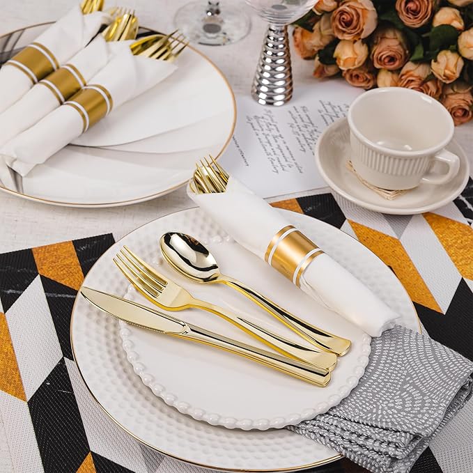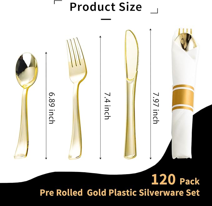 - GREAT VALUE 120 PACK: Effortlessly create a luxurious tablescape with our elegant pre rolled gold plastic silverware set. These gold wrapped silverware set disposable includes 120 forks, 120 knives, 120 spoons, and 120 premium napkins for an instantly elevated guest experience