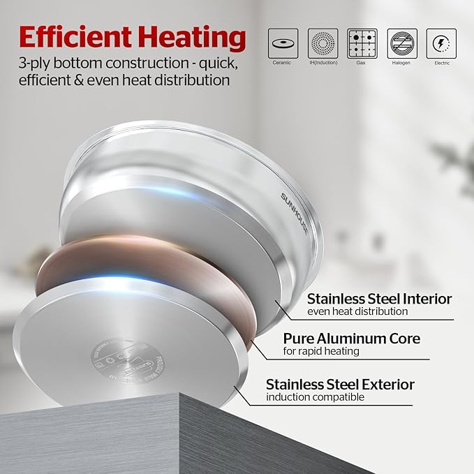 - All Cooktop Compatible: Ready for any kitchen. The encapsulated base ensures fast, even heating and is fully compatible with all stovetops, including induction, gas, electric, and ceramic, making it a future-proof addition to your cookware.
