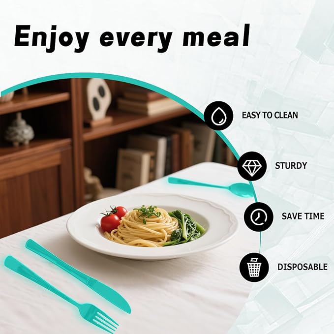 - [EASY CLEANUP] Skip the hassle of washing dishes! These light green disposable plastic forks, spoons, and knives make cleanup effortless—just toss after use. (Not for dishwasher, microwave, or oven.)