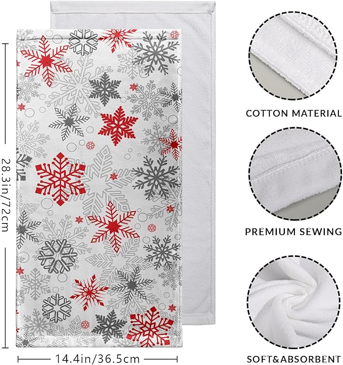 - Material and Size: Our snowflake hand towels are made of high quality cotton, soft to the touch, plush and absorbent. Each Christmas hand towel measures 14.4 x 28.3 inches