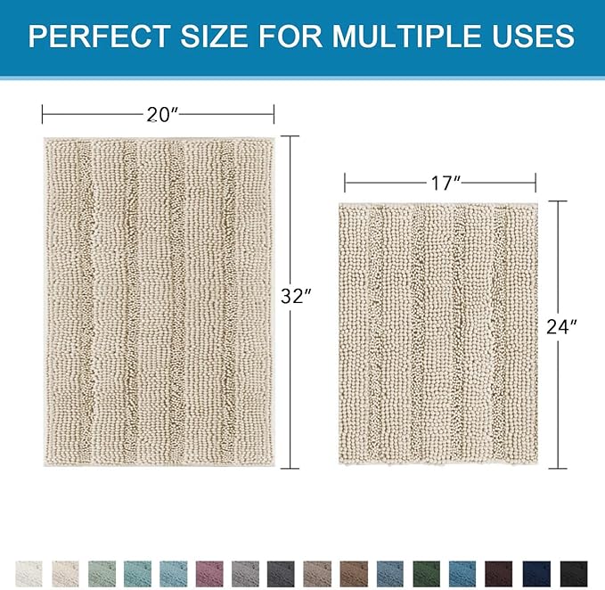 H.VERSAILTEX Bathroom Rug Sets 2 Piece Bath Mats Non Slip Thick Soft Chenille Striped Bath Rug achine Washable Shower Floor Rugs for Tub, Shower and Floor (Fog, 20" x 32"/17" x 24")