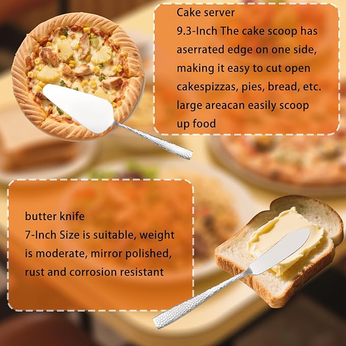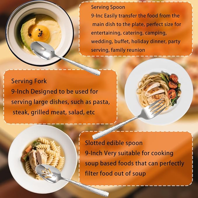 Large Hostess Serving Utensils Set, Stainless Steel Heavy Duty Hammered Serving spoons, Slotted Spoons, Serving Fork, Cake Server, Butter Knife, Dishwasher Safe(Silver)