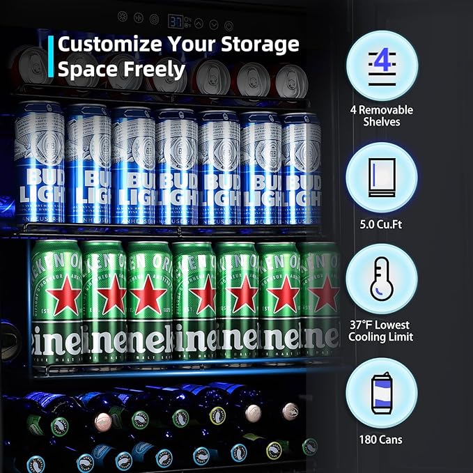 - Large Storage Capacity - This 24-inch beverage refrigerator can hold up to 180 cans of beverages (standard 12 ounces). Equipped with 4 removable shelves, you can flexibly adjust the space between shelves as needed to store different sizes and types of beverage cans, beer, soda, etc. Soft blue LED lights help you pick your favorite beverage at any time