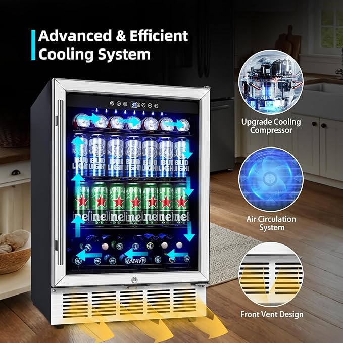 - Fast Cooling System - MZAVP Beer Refrigerator utilizes advanced compressor refrigeration technology and an internal air circulation system. Compared to traditional refrigerators, our compressor can fully utilize its performance to achieve lower energy consumption, quieter operation, and better cooling results. At the same time, the internal air circulation system ensures that cold air is evenly distributed throughout every corner of the refrigerator
