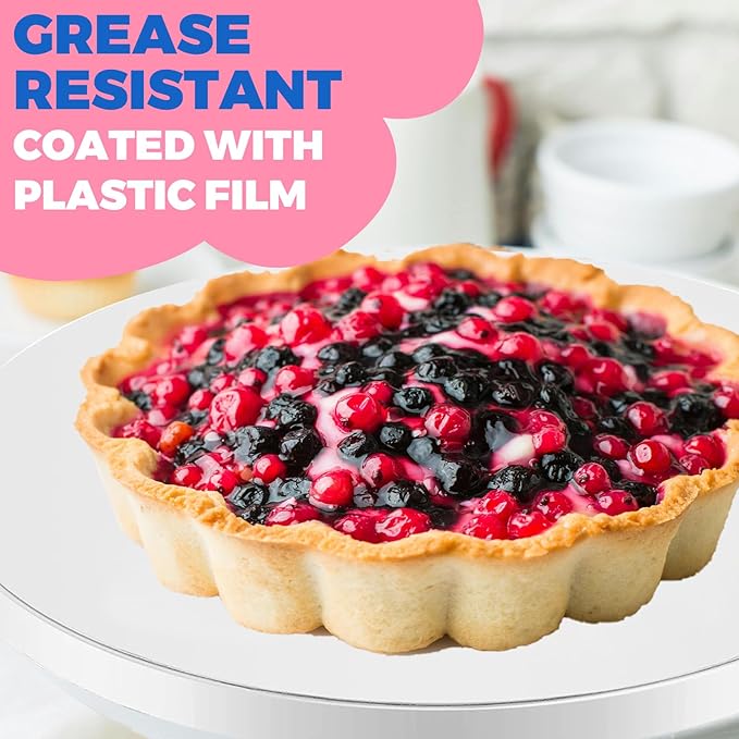 - 【oil-proof surface】The cake boards 12 inch has two sides: one side is coated with a glossy surface to prevent the round plate from absorbing oil and moisture; The other side is a matte surface to increase friction and prevent the cake from slipping out of your hands as it moves. Note that the shiny side of the cake board is the side in contact with the cake. You confidently make cream, chocolate, fruit or similar frosting and fillings.