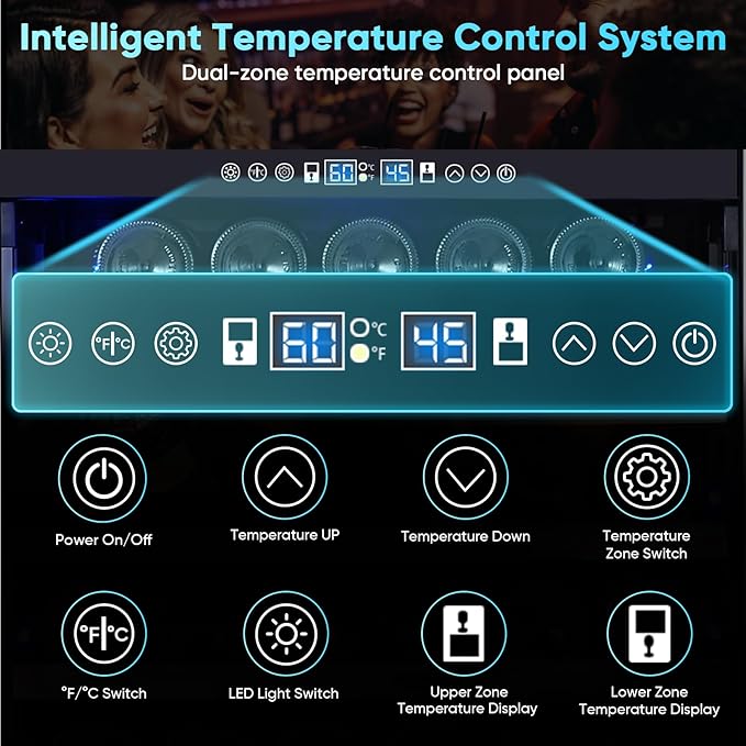 - Digital Temperature Control System and LED Mood Light - The wine cellar fridge includes a digital temperature control panel with indicator lights and a dynamic temperature display screen. Both the upper and lower shelves of the wine cooler are equipped with blue LED mood lighting. Not only does it allow you to showcase your collection, but it also creates a romantic and elegant atmosphere. At the same time, it allows you to quickly find the red or white wine you need