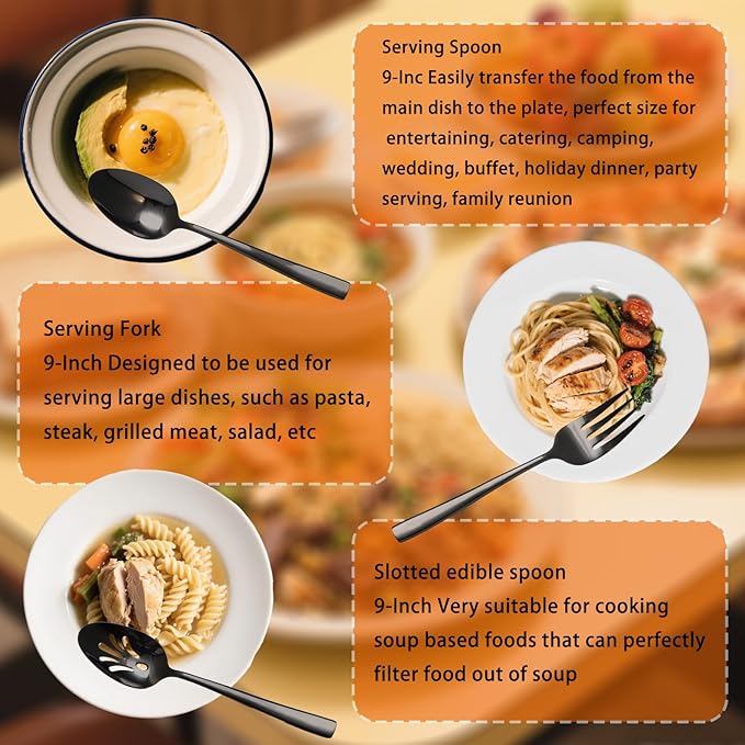 Large Hostess Serving Utensils Set, Stainless Steel Heavy Duty Serving spoons, Slotted Spoons, Serving Fork, Cake Server, Butter Knife, Dishwasher Safe (Black)