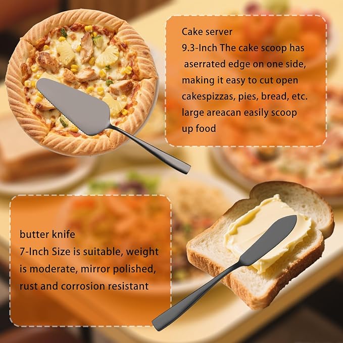 - 5 Piece Serving Utensils Set: Serving spoons x1 (9 inches) , slotted spoons x1 (9 inches) , serving fork x1 (9 inches) , cake server x1 (9.3 inches) , butter knife x1 (7 inches)