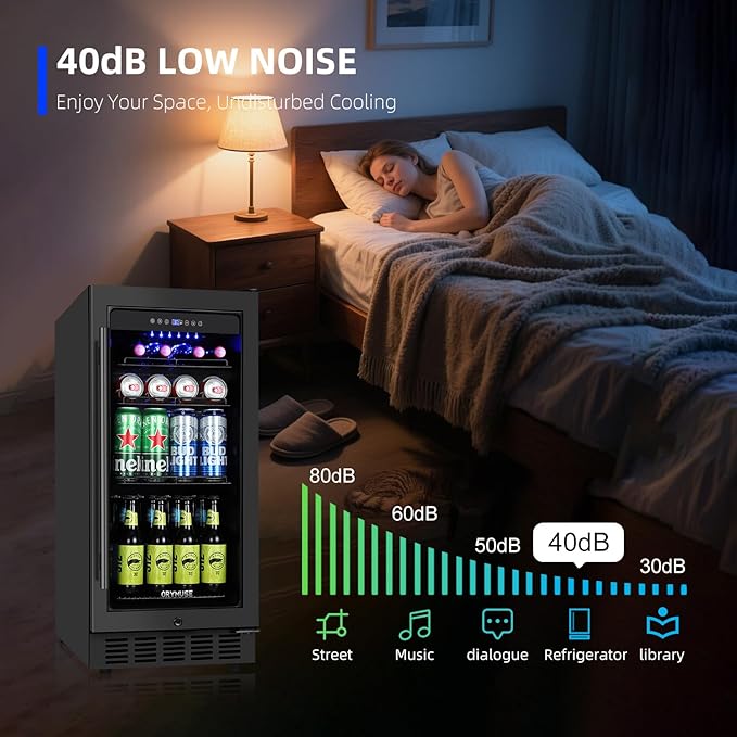 - CHILL IN STYLE, SERVE WITH EASE - This ORYMUSE 15 inch beverage refrigerator can hold up to 130 standard 12-oz drinks. Whether you're entertaining friends or family, it provides ample refreshments to keep everyone cool. The built-in blue LED lights emit a soft, captivating glow, making it easy to find your favorite drinks even in low-light conditions. The lighting adds a touch of modern elegance to your space while enhancing the visibility of your beverage collection