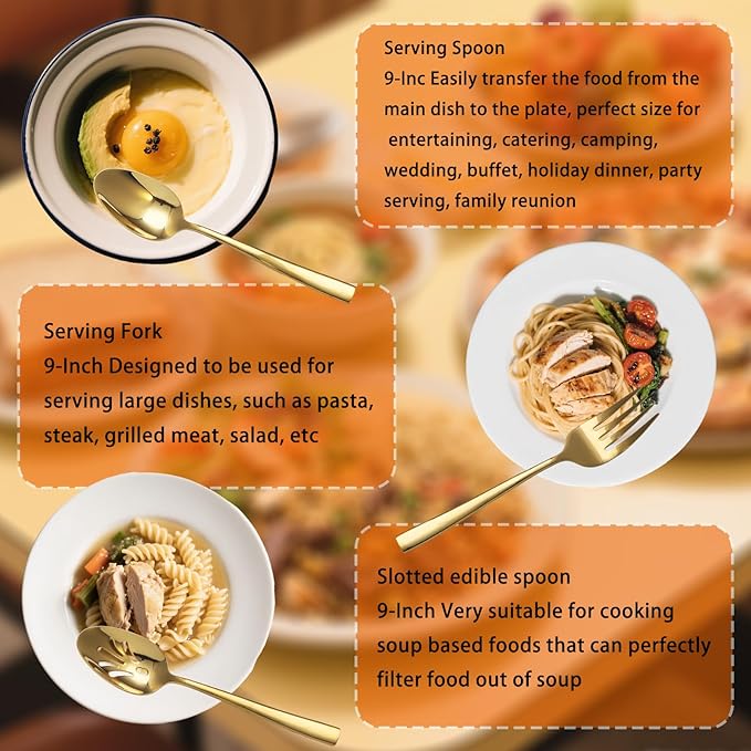 Large Hostess Serving Utensils Set, Stainless Steel Heavy Duty Serving spoons, Slotted Spoons, Serving Fork, Cake Server, Butter Knife, Dishwasher Safe (Gold)
