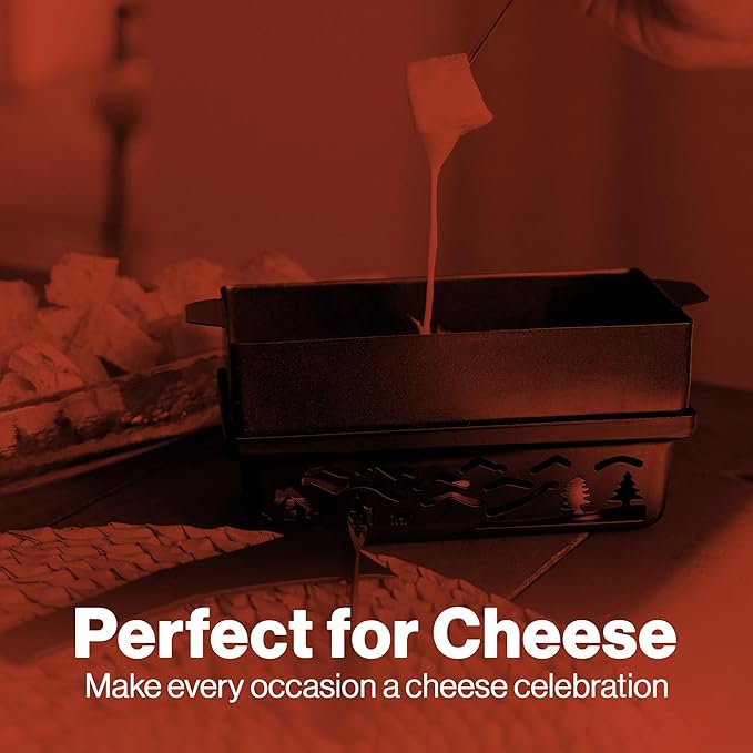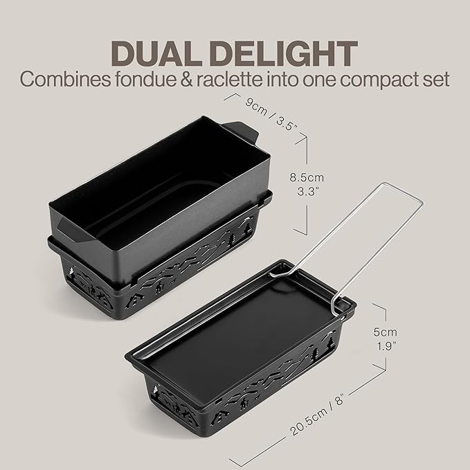 - Complete Serving Kit Included – Comes with everything you need: base stand, fondue pot, raclette dish, raclette spatula, 2 fondue forks, and 4 tealight candles.