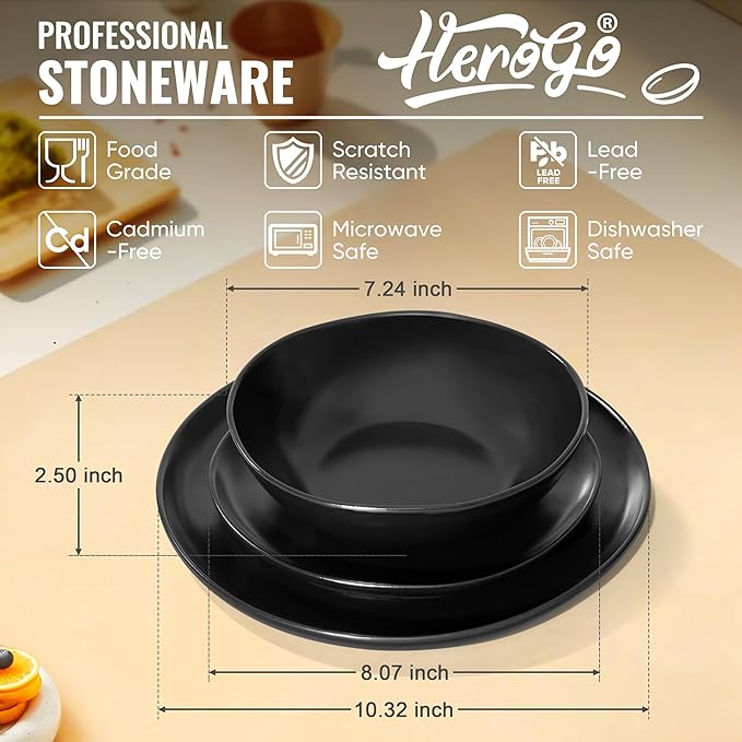 Herogo 12Pcs Plates and Bowls Set for 4, Irregular Handmade Stoneware Dinnerware, Crack and Scratch Resistant, Microwave & Dishwasher Safe, Reactive Glaze, Artistic Rustic Tableware, Matte Black