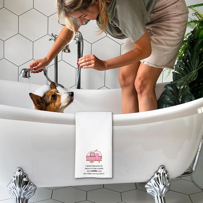- Sassy Camping Design: Features the fun phrase “I Never Dreamed I’d Grow Up to Be a Super Sexy Camping Lady”, this towel brings personality and laughs to any RV or campsite—perfect for camping kitchen towels lovers.