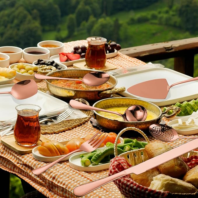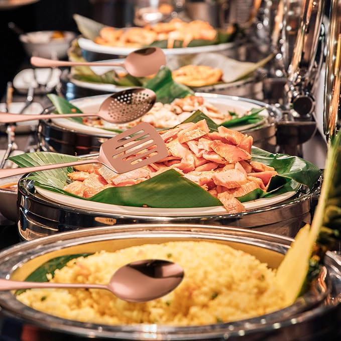 - DURABLE STAINLESS STEEL: The rose gold/copper catering utensils set is crafted from durable stainless steel, ensuring long-lasting performance . Perfect for both professional kitchens and home use, this set combines strength with sleek, easy-to-clean design for reliable daily use.