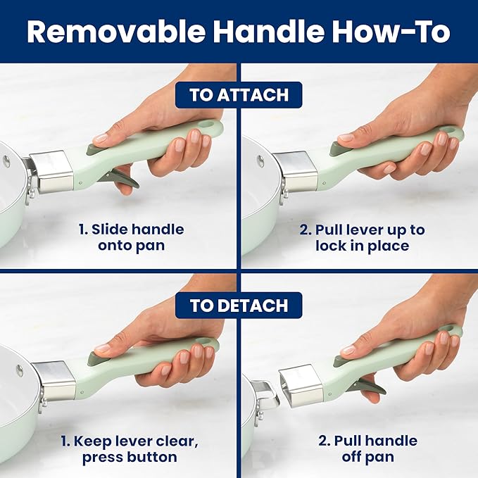- REMOVABLE HANDLE WITH SECURE LOCKING SYSTEM: The detachable handle features a secure locking system that holds up to 22 lbs and attaches from the outside to maximize cooking space, no contact with food! Remove the handle for compact storage or to fit more easily in the dishwasher. (Note: Handle is hand wash only)