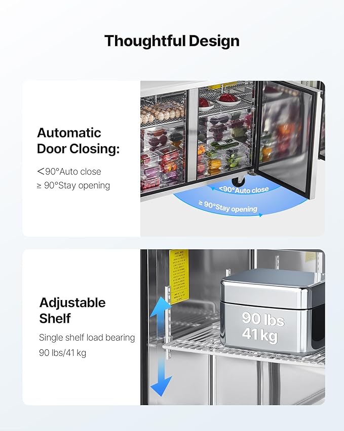 - Auto-Closing Door: When the door opens within 90°, it automatically snaps shut—no need to push, and no cold air lost. The adjustable shelving in this sandwich prep cooler provides two-tier storage, with each shelf holding up to 90 lbs