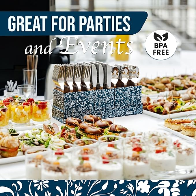 - CONVENIENT: These plastic silverware caddy with disposable silverware heavy duty tableware utensils not only look great but are also very sturdy. We Are Proud To Say That Our durable utensil sets with disposable spoons plastic forks heavy duty & plastic knives heavy duty Is Made with Bpa Free Plastic That Is Recyclable Too! It Is The Perfect Holiday and Thanksgiving cutlery - upscale disposable dinnerware