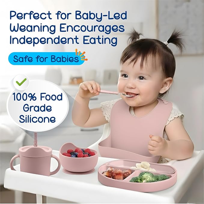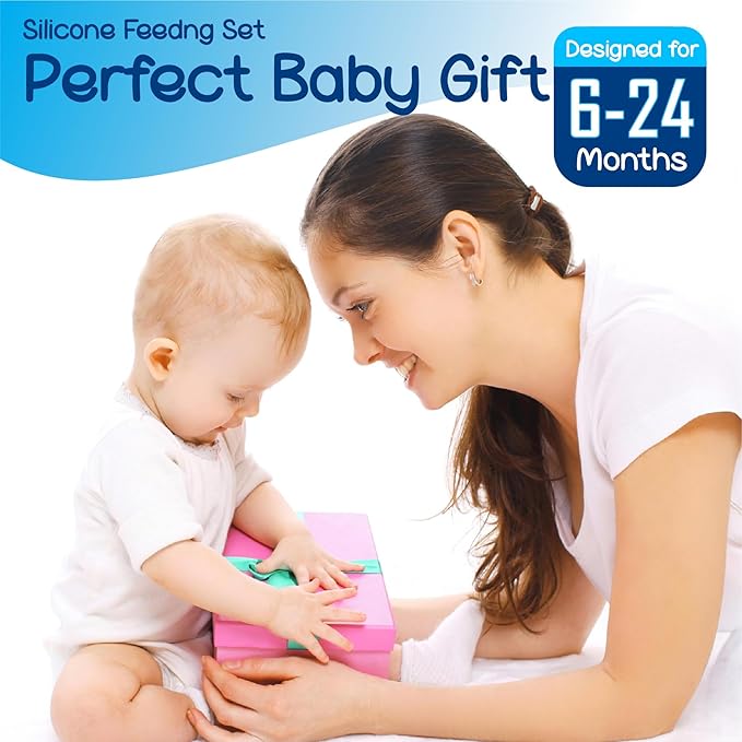 - 🍼 COMPLETE 16-PIECE SET – Includes suction plate, sippy cup, bib, suction bowl, 2 utensils, and 2 pacifier feeders ✅ 100% BPA-FREE SILICONE – Safe, soft, durable, and easy to clean 💪 PROMOTES INDEPENDENT FEEDING – Ergonomic utensils & non-slip base help toddlers build confidence 🔄 MICROWAVE & DISHWASHER SAFE – Convenient for parents, tough on messes 🎁 PERFECT GIFT IDEA – Beautiful muted blue color, ideal for baby showers or birthdays