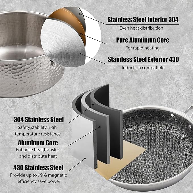 - 🔥 PREMIUM CONSTRUCTION: Triple-layer design with 304 stainless steel interior, pure aluminum core, and 430 stainless steel exterior for optimal heat distribution and durability