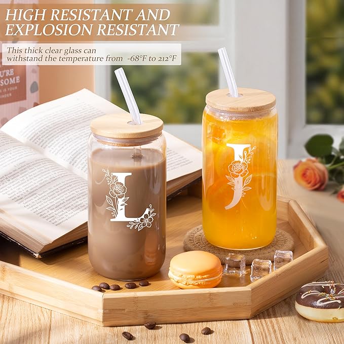 Personalized Gifts for Women, Monogrammed Gifts for Women, Initial 16 oz Glass Cups With Lids and Straws, Customized Mug, Personalized Birthday Gifts Christmas Gifts for Her Mom Friend Woman, L