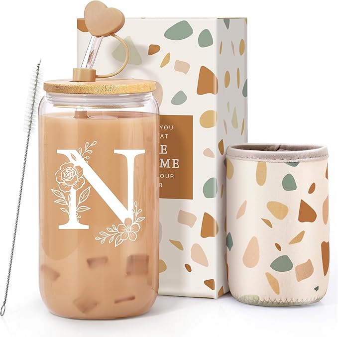 Personalized Gifts for Women, Monogrammed Gifts for Women, Initial 16 oz Glass Cups With Lids and Straws, Customized Mug, Personalized Birthday Gifts Christmas Gifts for Her Mom Friend Woman, N
