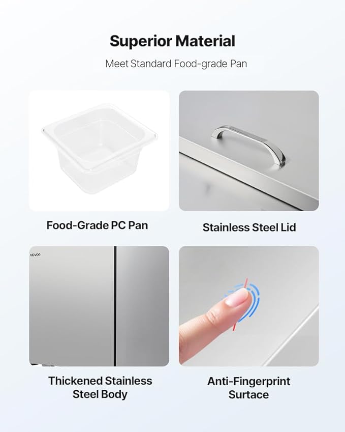 - Premium Material: Food-grade PC pans meet ANSI tested standards, providing peace of mind for food storage. The sandwich fridge with stainless steel build is durable and easy to clean, with brake casters for smooth mobility