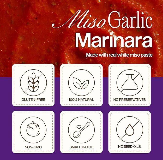 - Bring depth and richness to your pasta with our Miso Garlic Marinara, where slow-simmered tomatoes meet umami-packed white miso and aromatic garlic for a uniquely savory experience.