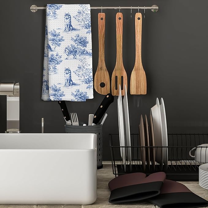 Chinoiserie Husky Dog Kitchen Towels,Blue and White Floral Botanical Husky Grandmillennial Weiner Dog Decorative Hand Towels for Kitchen Bathroom,16x24 Inch