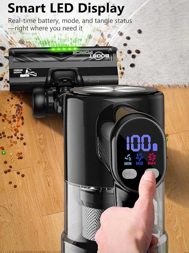 - 3 Suction Modes + Smart LED Display: Switch between MIN, MID, and MAX modes with a single touch to match different floor types and mess levels. Through real-time monitoring of the vacuum cleaner screen in real time to understand the vacuum battery power, suction mode and fault alarm, easy enough for anyone, even seniors, to operate confidently.