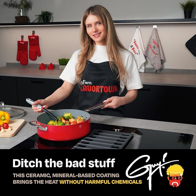 Guy Fieri's Flavortown 11-Piece Ceramic Cookware Set, Nonstick Pots and Pans for Cooking, Made without PFAS PTFE PFOA, Oven Safe, Dishwasher Safe, Easy to Clean Everyday Cookware, Red