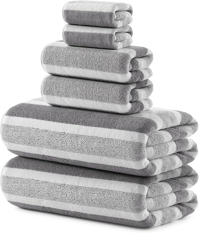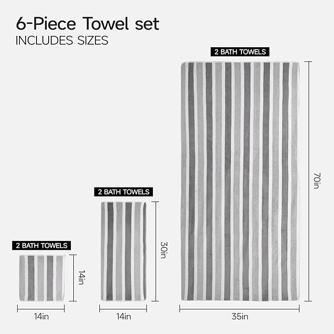 - 【OVERSIZED 6-PIECE BATH TOWEL SET】Includes 2 bath towels(35"x70"), 2 hand towels(14"x29"), 2 washcloths(14"x14"). Provides full-body coverage for adults, ideal for bathroom, gym, spa and hotel use.