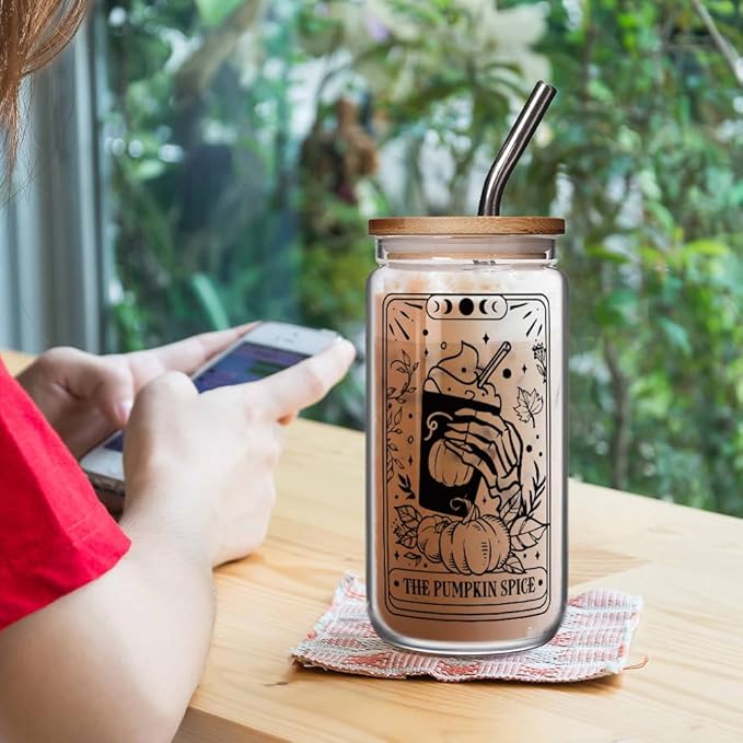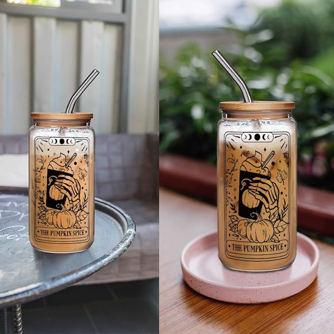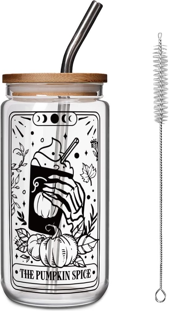 Fall Pumpkin 16 OZ Glass Cups with Lids and Straws, Thanksgiving Tarot Tumbler Mug, Fall Gifts, Halloween Boo Basket Gifts for Women