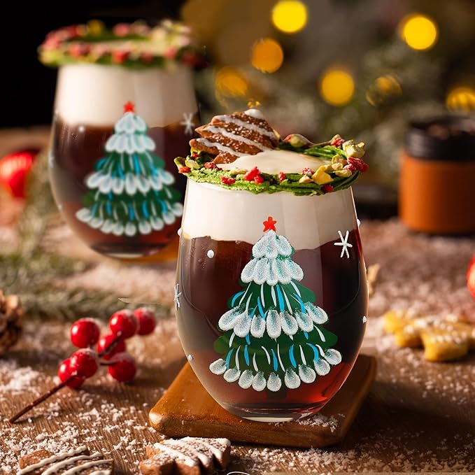 - Hand-Painted Holiday Design: Celebrate the winter season with our cute stemless wine glasses featuring artisan hand-painted green Christmas trees and white snowflakes. The wine cup’s pattern is adorned with shimmering powder, glistening like freshly fallen snow. Unlike mass-produced printed designs, each glass is a unique masterpiece that adds a touch of hand painted elegance to your holiday table.