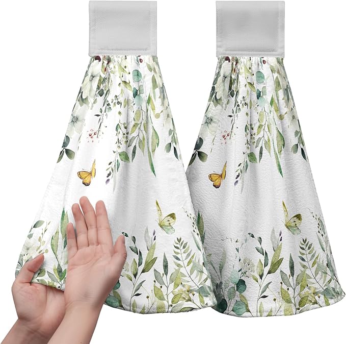 Eucalyptus Leaves Green Hanging Kitchen Towels Flowers Butterfly Hand Towels with Hanging Loop Sage Leaf Summer Dish Towel Washcloth Soft Tie Towel for Bath Kitchen