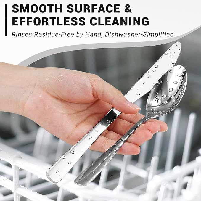 - 【EASY TO CLEAN】This stainless steel silverware set has a smooth surface that helps keep food from sticking. Better yet, this kitchen utensils set seamless design allows water and detergent—and it’s fully dishwasher safe, so post-meal care is a breeze to keep your cutlery looking pristine.For even better care, we recommend wiping it clean with a soft cloth; plus, drying it quickly right after washing will help maintain its shiny luster.